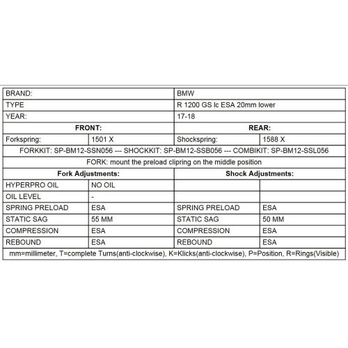 The height lowering replacement springs has been designed to match the BMW R1200GS(LC) perfectly This spring set provides you with a -20mm reduction in height without affecting the riding properties - at the expense of a little ground clearance. The progressive springs have been designed to match the original shocks BMW R1200GS(LC) perfectly, and offer good response and safety in extreme situations. The balance of your motorcycle remains fully intact..