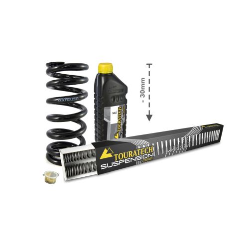 The height lowering kit by Touratech Suspension, from the Dutch specialist Hyperpro. The set includes replacement fork springs and a replacement spring for the shock absorber. This spring set provides you with a sensible 30mm reduction in height without affecting the riding properties - at the expense of a little ground clearance. The progressive springs have been designed to match the BMW F750GS and F800GS perfectly, and offer a tremendous improvement in response and greater safety in extreme situations. Replacing the front and rear springs will lead to a significant improvement in your suspension system. Street legal.