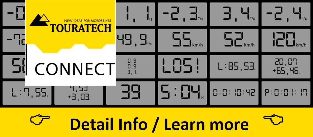 TOURATECH CONNECT remains permanently connected to the motorcycle and as long as ignition is on, it continuously delivers information to the rider's cell phone - during the ride and afterwards. The system works completely OFFLINE, an Internet connection is not necessary.