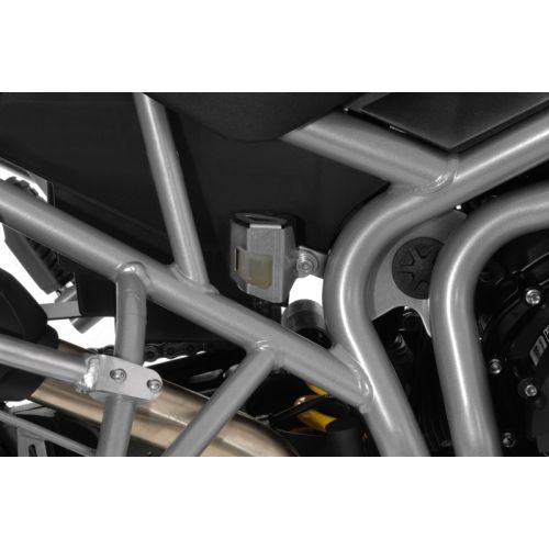 On the Tiger 800 the brake fluid reservoir is all too easily accessible, putting it at risk of damage or tampering. Made from laser-cut stainless steel, Touratech’s brake fluid reservoir guard effectively prevents damage and undesired access to the reservoir lid, yet you can still easily see the fluid level. The guard simply bolts onto the existing mounting point.