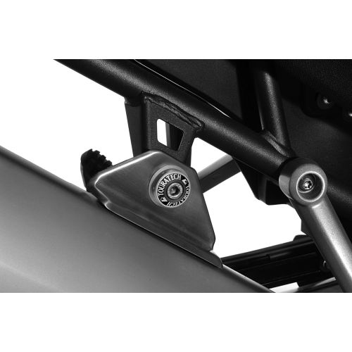 Touratech’s cover for the rear silencer mount is milled from a single piece and replaces the simple bolt that is used to attach the silencer. Available to match the Touratech oil filler cap, frame plugs or swingarm bearing cover in gold, red, black or titanium colours.